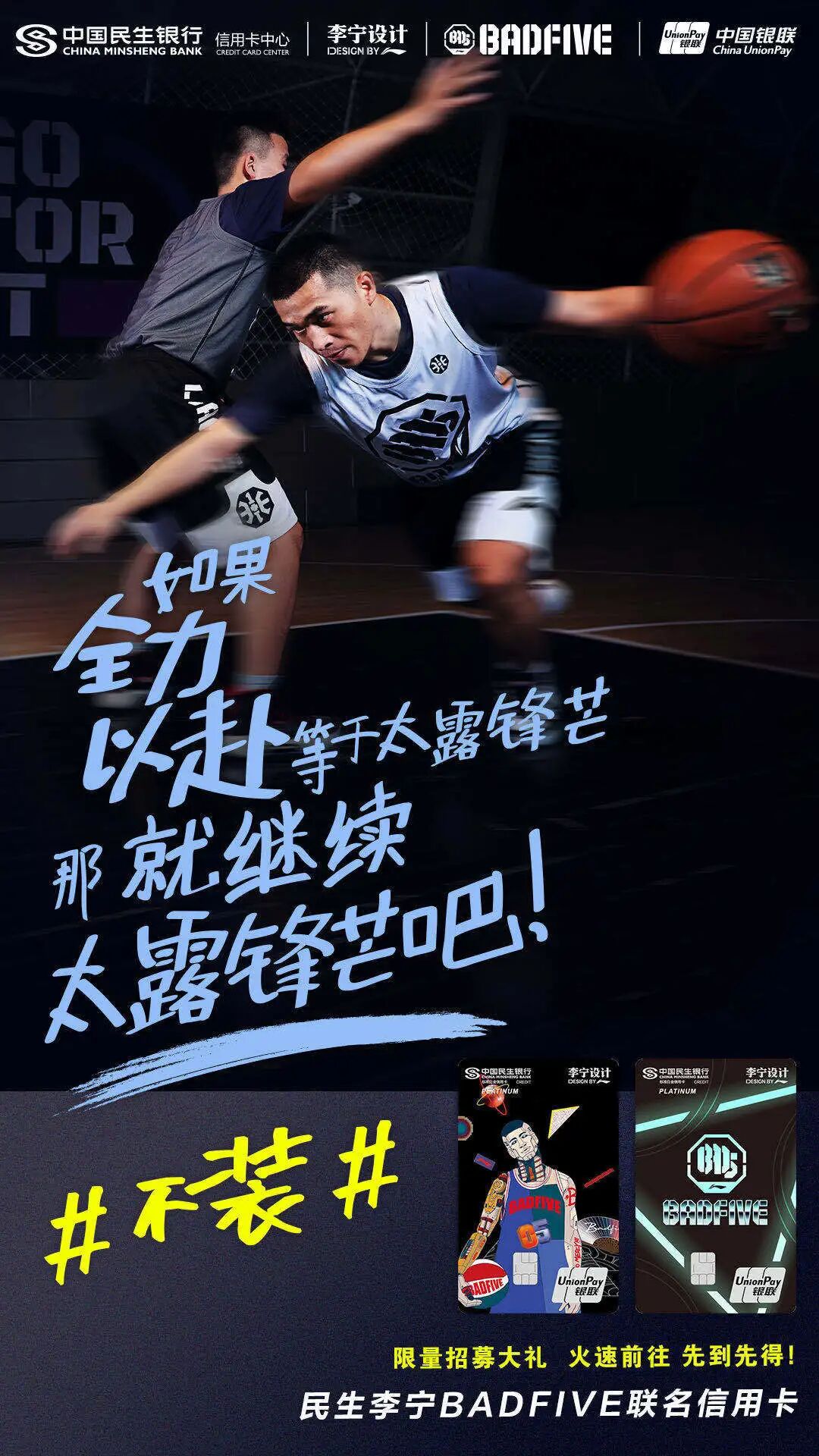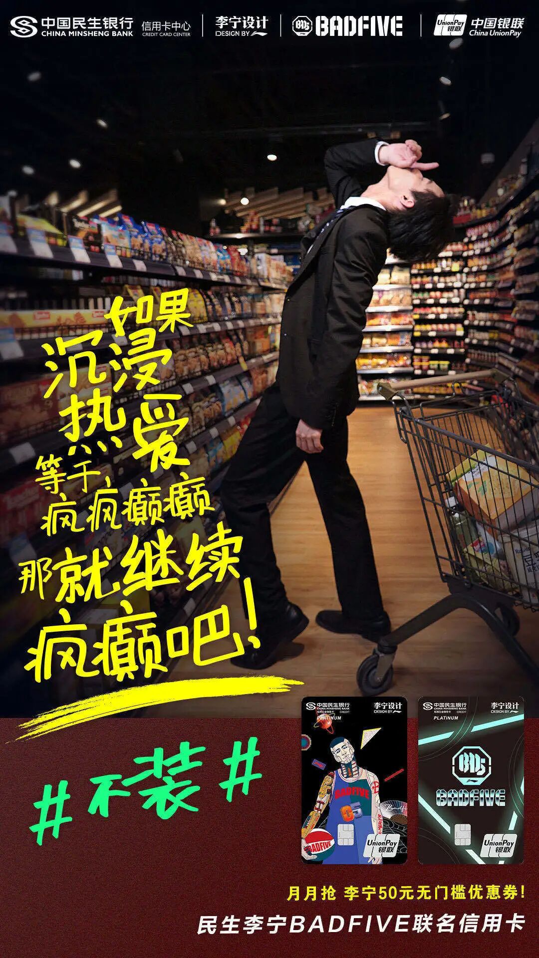 仔细拆解了民生信用卡的打法,我发现这波操作并没有停留在单一的概念层面,而是从年轻人喜闻乐见的方式出发,跟他们真正玩到一块去。1、定制李宁BADFIVE联名卡,打造具象化“不装”当代年轻人对很多东西的关注,都是始于高颜值、有设计感的元素,只有这样他们才会多看你一眼。民生信用卡与李宁设计推出的民生李宁BADFIVE联名信用卡,高颜值的卡面恰恰解锁了年轻人的审美观,卡面设计充满街头潮流文化的荷尔蒙和黑科技感,与当代年轻人的喜好如出一辙。