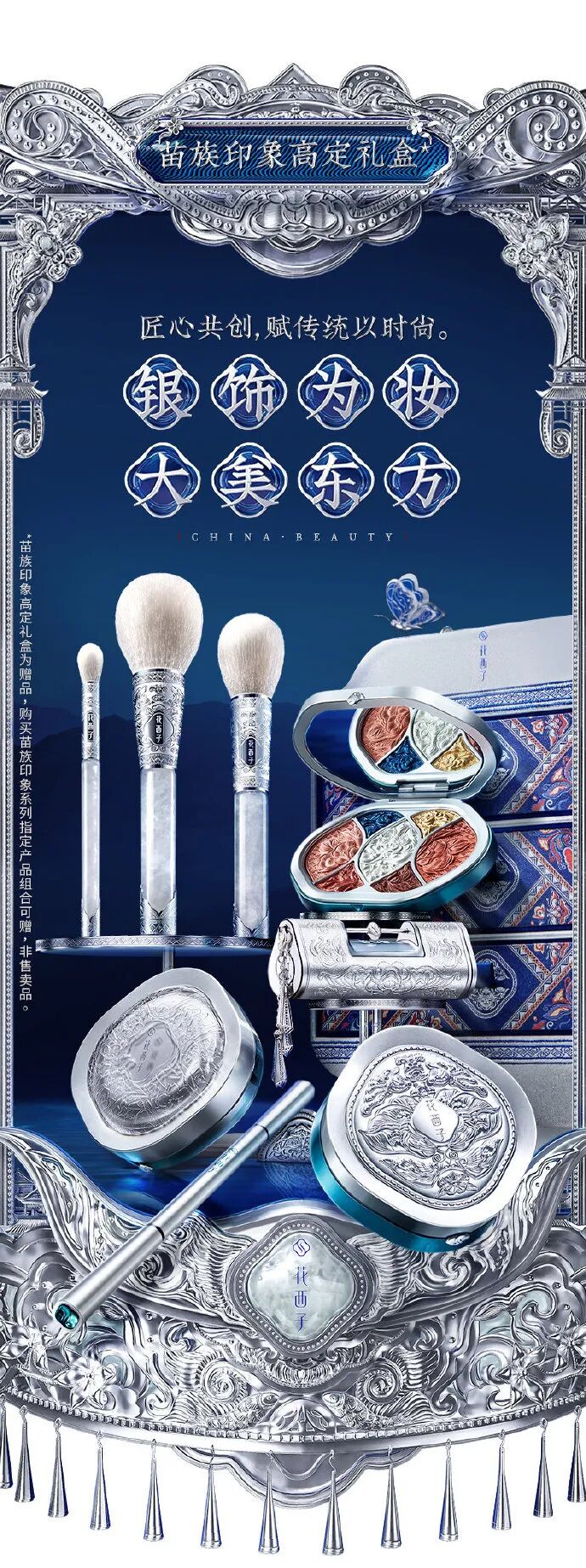 除了常规的标品,花西子也一直有一条品牌产品线来夯实它的品牌理念和它作为东方美学彩妆的基底——从19年4月的雕花口红,到19年末的百鸟朝凤盘,再到20年的同心锁礼盒和最近双十一刚上线的苗族礼盒。