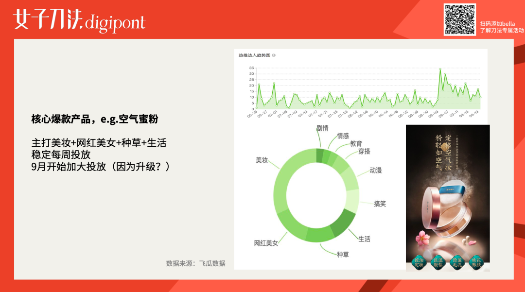 如果是功能性产品。例如核心爆款产品,蚕丝蜜粉,花西子会主打美妆+网红美女+情感+剧情,稳定每周投放。