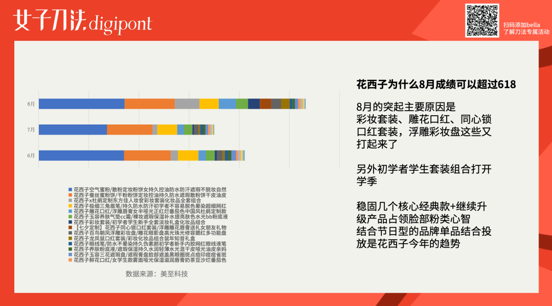 8月的突起主要原因是彩妆套装、雕花口红、同心锁口红套装、浮雕彩妆盘这些又打起来了,而这些都是非常适合送礼的单品。