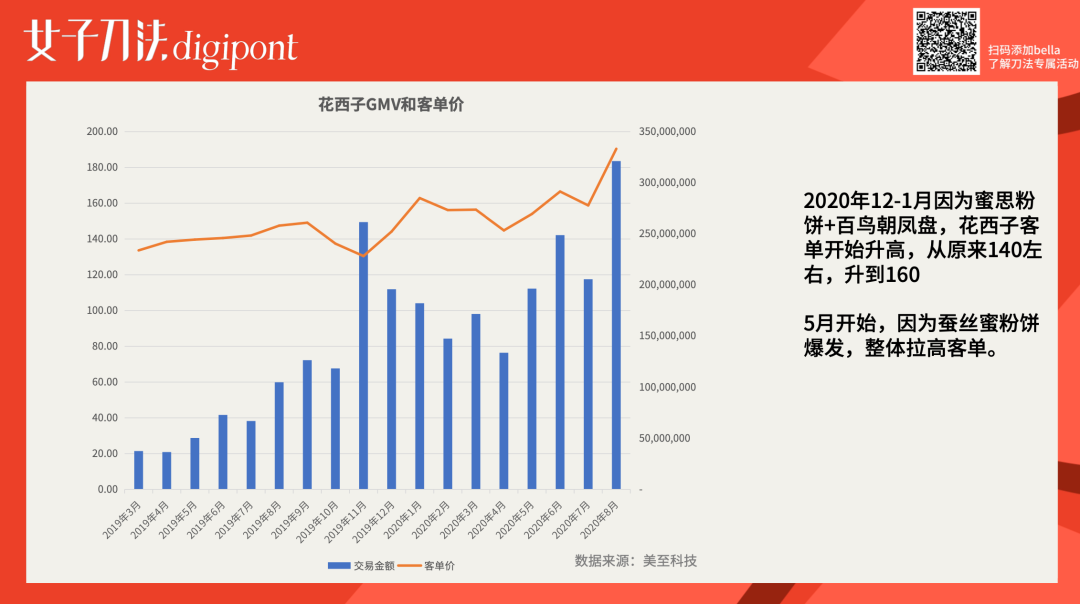 花西子的客单升高点和百鸟朝凤、蚕丝蜜粉饼的上线时间非常吻合,可以解释这两个品也起到了逐渐把花西子的平均客单拉高的作用。