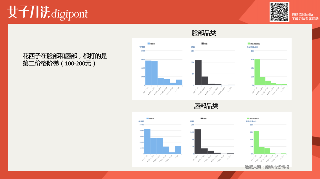 比如,我们看脸部品类,天猫上的价格分布,其实100-200元价格带的销售额可以基本和100元以下的销售额持平。