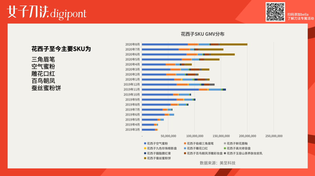 我拉取了占比花西子60%以上销售额的SKU的每月销售额数据。数据来源:美至科技