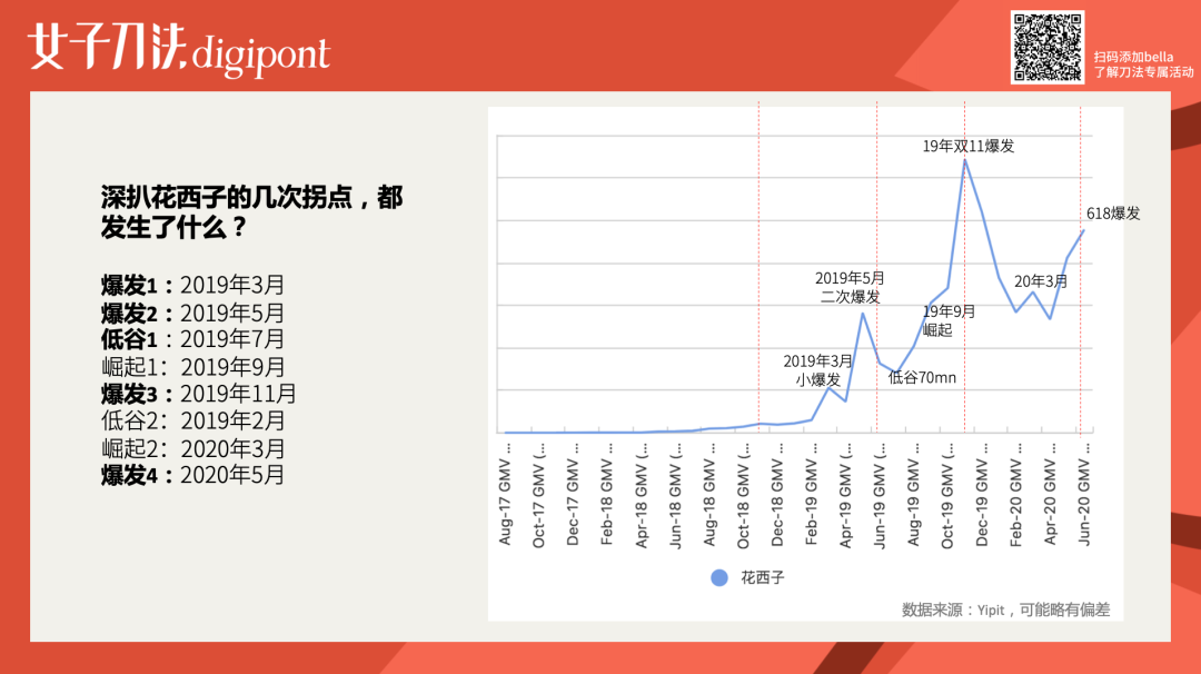 花西子几个重要销量增长拐点是2019年3月、5月、9月、11月。2020年3月和6月。