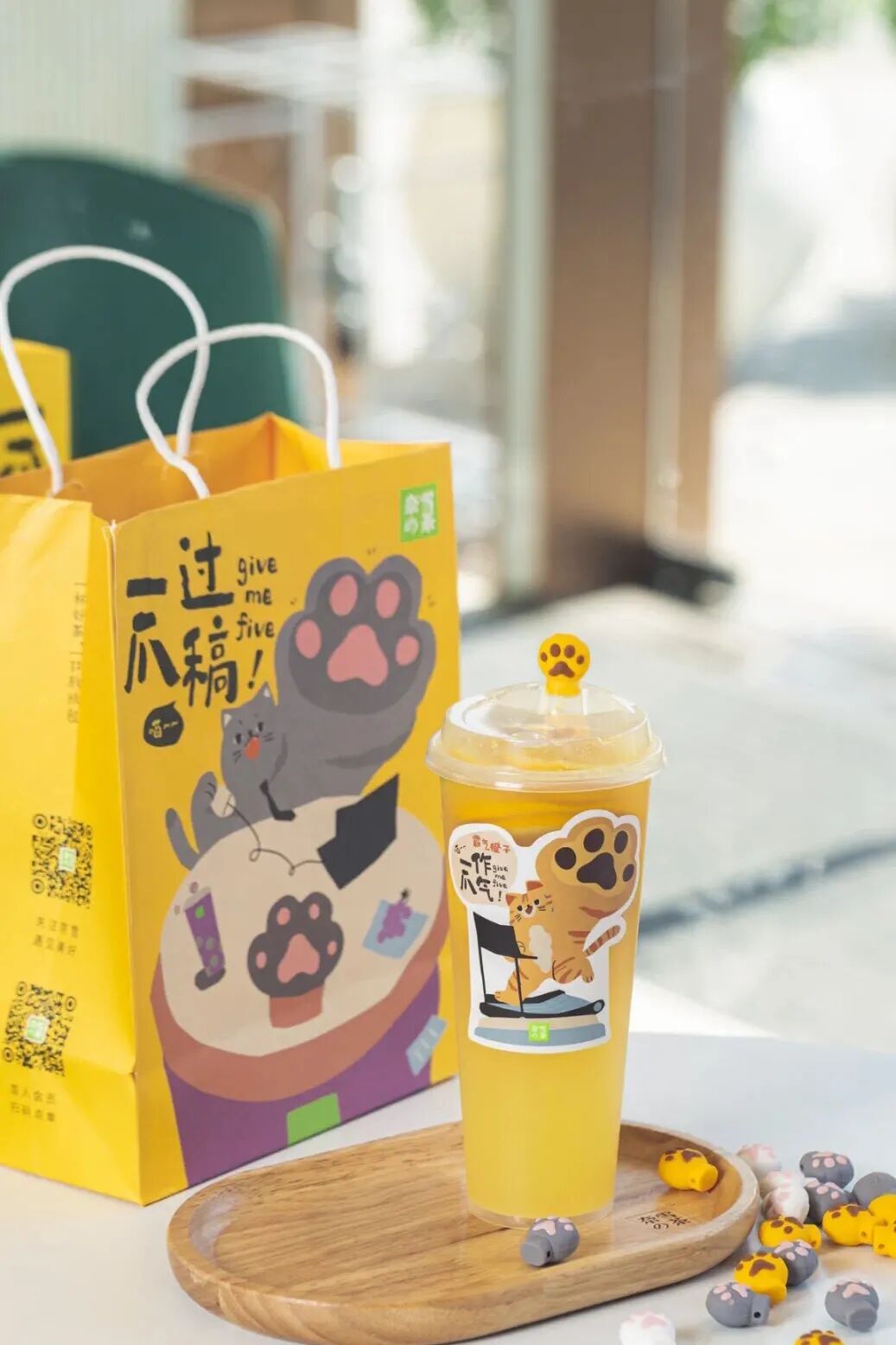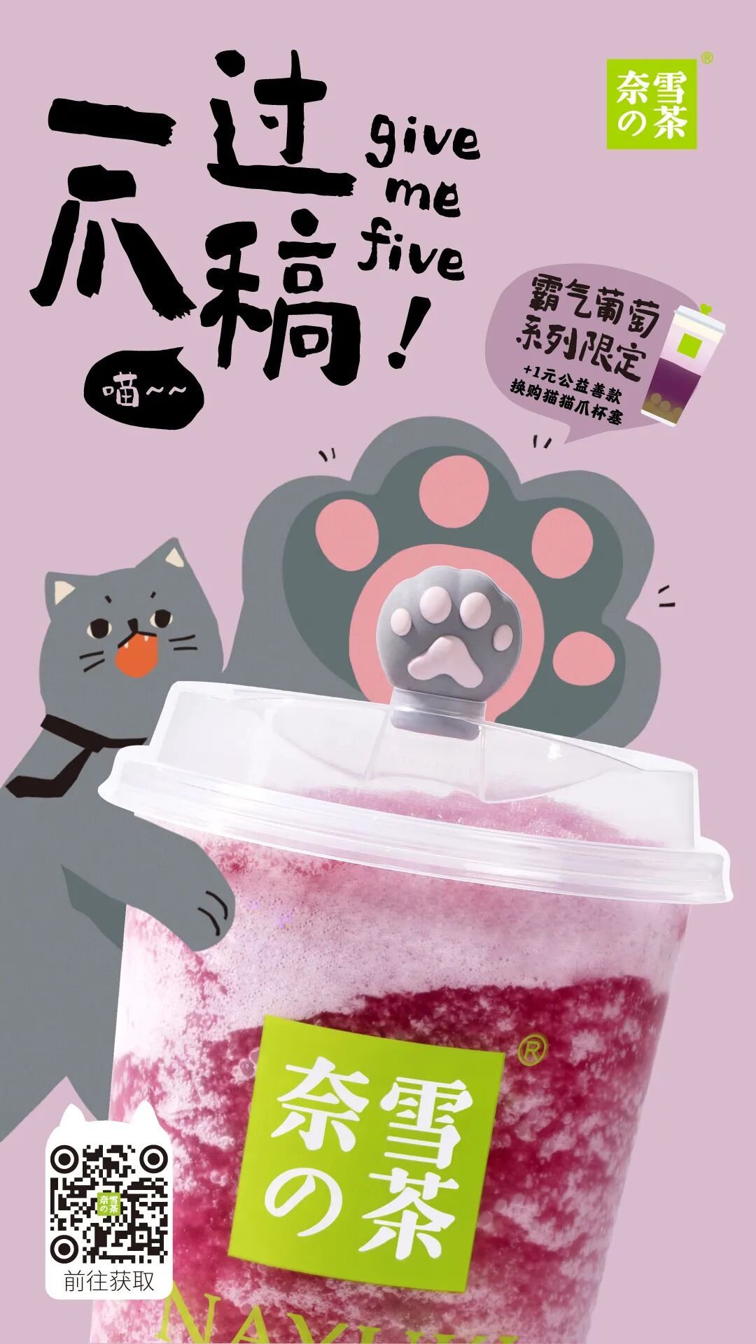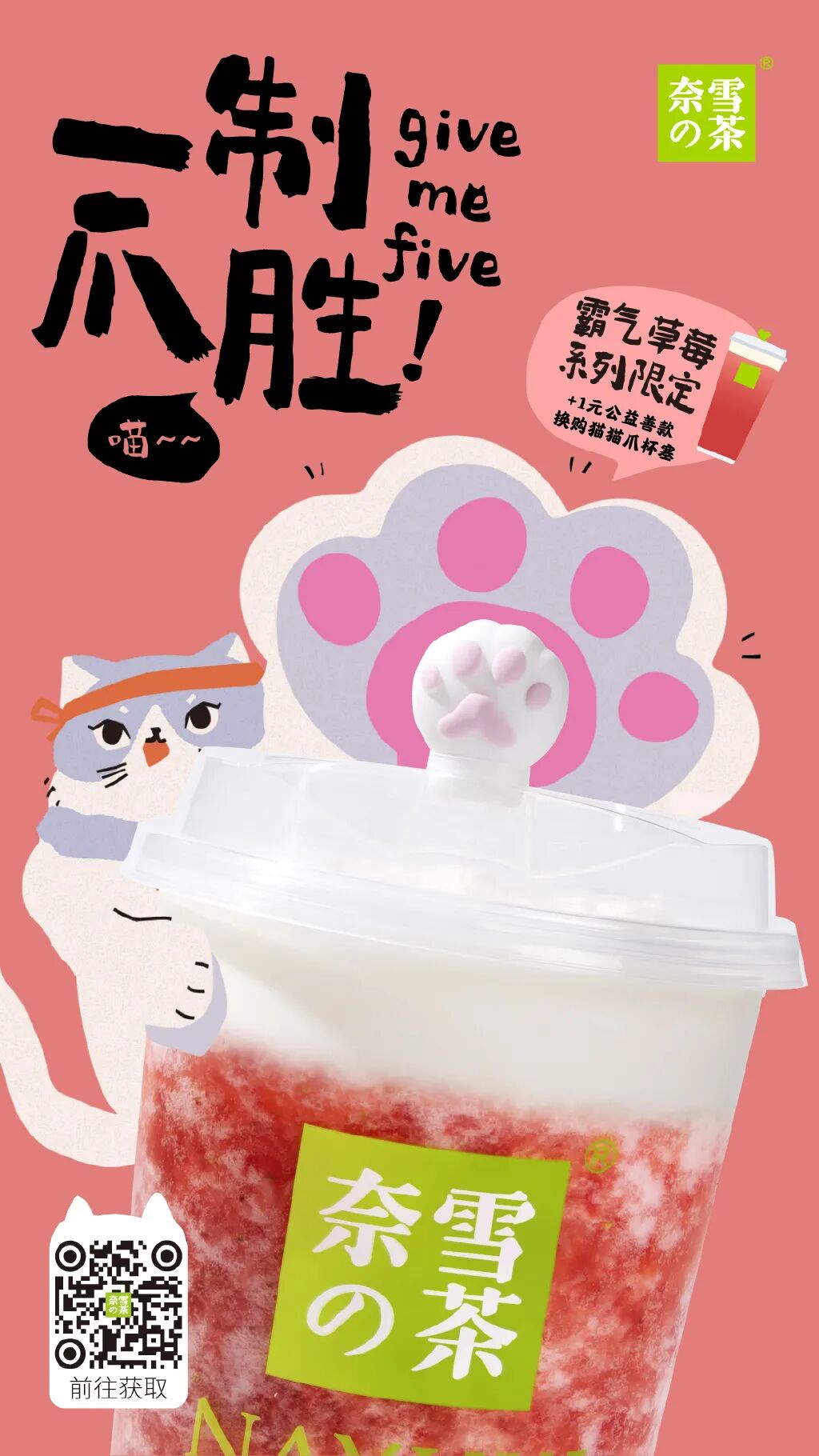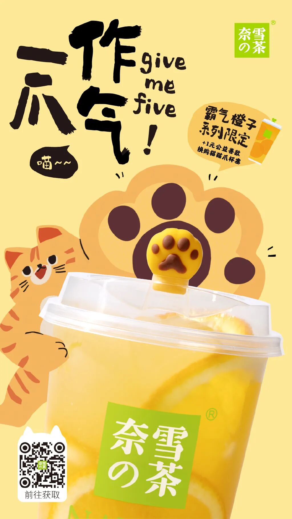 个性可爱的猫猫爪杯塞,既加强了杯子的可爱属性,又赋予了奶茶杯情感属性,让奶茶不仅是一款产品,更是与消费者直接沟通的“媒介”,借助猫爪元素,与消费者建立情感连接。