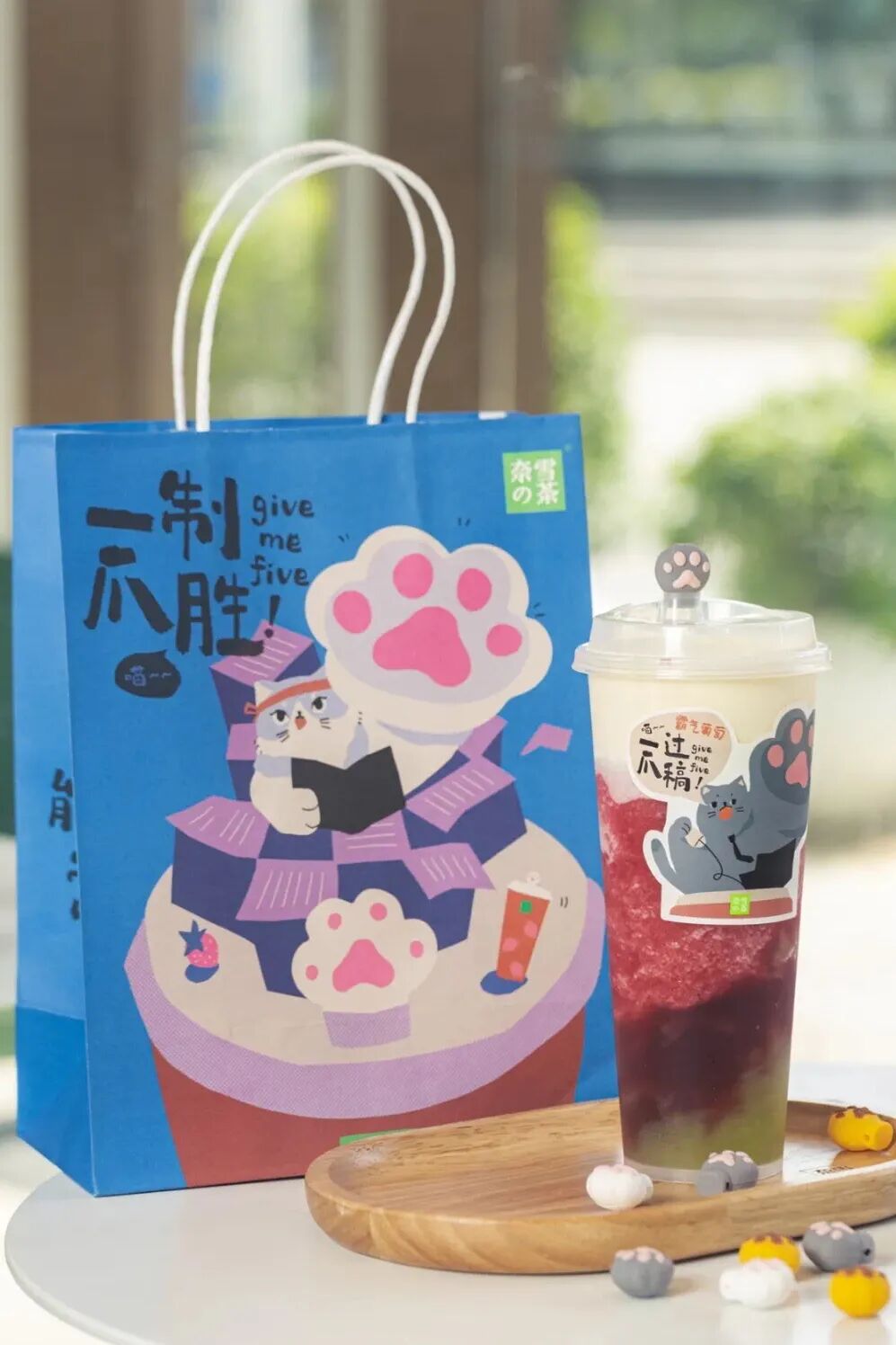 史上第一款「猫猫爪杯塞」为奈雪原创设计,是第一个将杯塞设计为猫爪形状的品牌,新奇独特的包装,与市面上的奶茶杯形成有效区隔。
