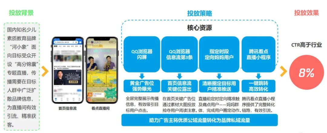 此外,腾讯看点构建了从营到销的闭环,并且各个营销触点增加转化路径,将流量顺势转化为销售力,而且丰富了用户的消费路径,缩短了决策时间和成本。举例来讲,国内知名少儿素质教育品牌“河小象”,通过腾讯看点的多组合资源投放,实现了在目标人群中广泛传播的营销目的,并且通过指定时段定向妈妈群体用户,实现精准触达。