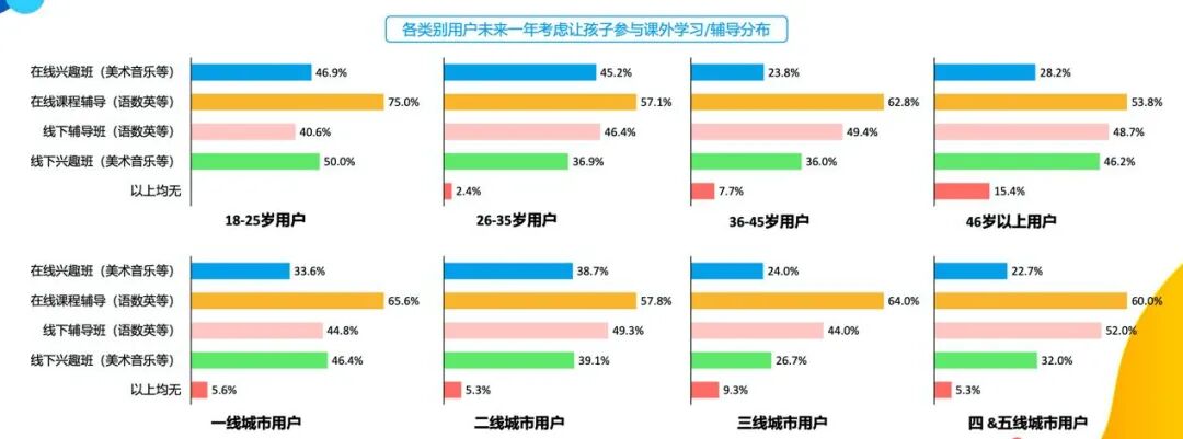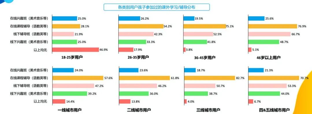 除了重视语数英主科教育外,一二线城市家庭和年轻父母同样重视孩子的美育教育。数据显示,在美育在线课程上,18-25岁和26-35岁用户参与报名的占比分别为46.9%和45.2%;反观36岁及以上用户家庭,语数英主科在线辅导仍然是家长的第一需求。