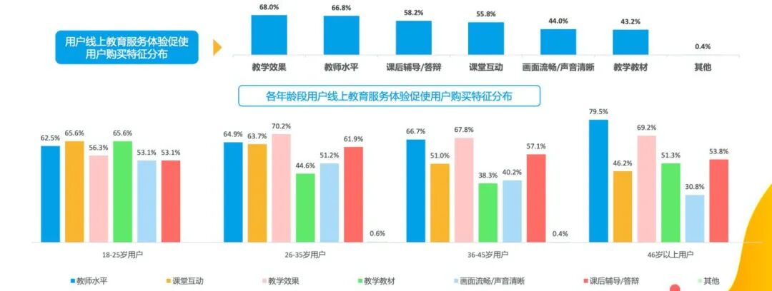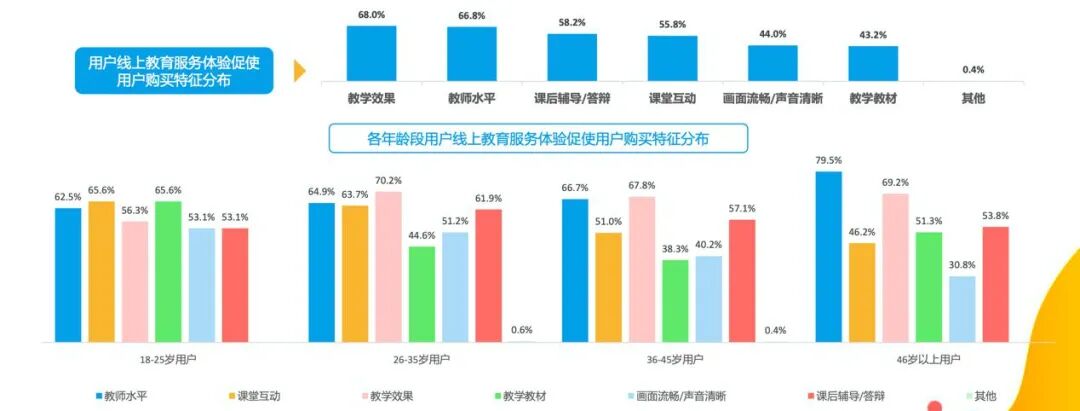 在服务层面上,大部分用户更看重教学效果和教师水平,占比分别为68%和66.8%,是影响用户选择的重要因素,而18-35岁的年轻父母还比较看重在线课堂的互动效果。