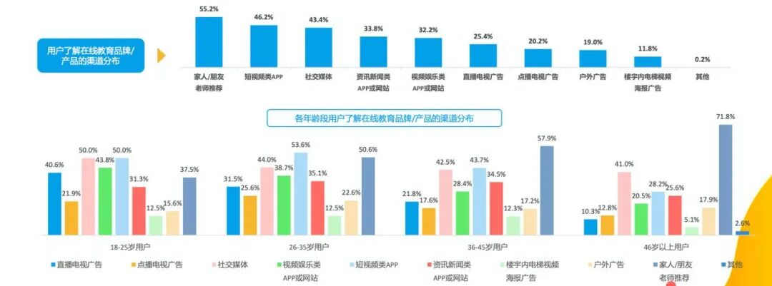 口碑、师资和价格是影响看点平台用户消费决策的三大关键因素。在了解线上教育信息时,除了家人朋友推荐外,短视频APP和社交媒体成为重要渠道,分别占比46.2%和43.4%。