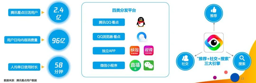 腾讯看点拥有腾讯 QQ · 看点、QQ浏览器 · 看点、独立APP和微信小程序四类分发平台,以及“推荐+社交+搜索”三大引擎,通过场景化智能推送用户感兴趣的广告内容,同时通过标签和大数据能力赋能投放全链路数字升级,保证独立用户最大化触达,使得信息传递更加精准,广告效果非凡。