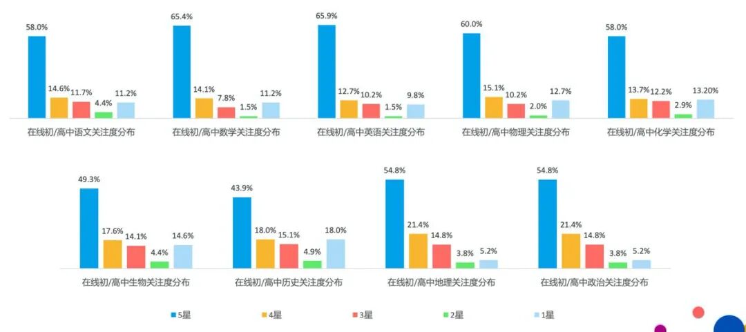 值得关注的是,小学阶段和初高中阶段的用户家庭,依然最关注主科课程在线教育。其中,孩子处于初高中阶段的家长还关注数学和物理,在这一阶段中理科渗透率高于文科。