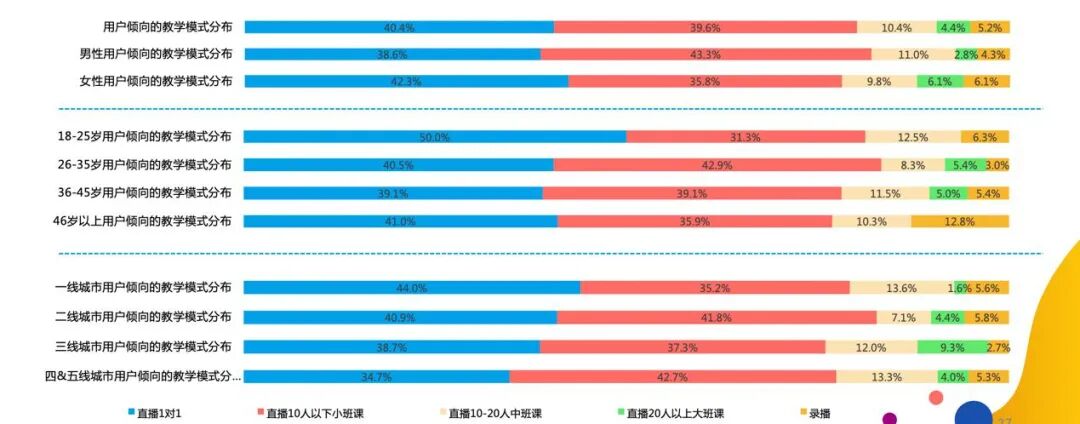 从报告中还可以看出,各线级城市用户都对平台价格比较敏感,尤其是26-35岁和46岁以上的用户对价格更为敏感。其中,每节课在50元以下的价格最有竞争优势。在单节课价格高达150-200元的教育消费态度上,四五线城市家庭的选择占比甚至高于一二线高收入城市家庭,这也进一步体现了下沉市场对孩子教育的重视程度。