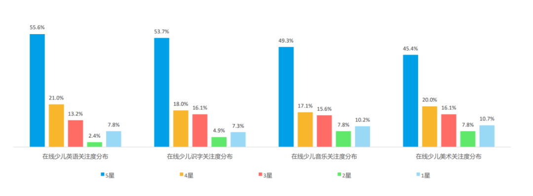 不同于兴趣教育或主科课程在各年龄段用户中各有侧重,在线上英语课程关注方面,无论是学龄前、小学,亦或是初高中阶段的家庭,都将英语教育排在首位。