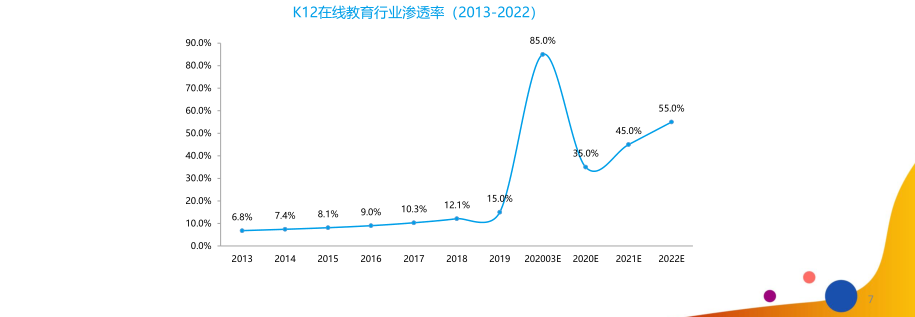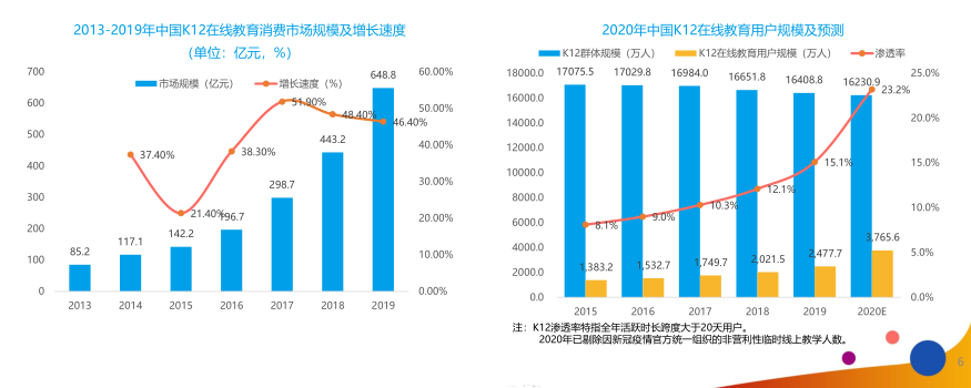报告显示,2019年K12在线教育整体市场规模已达648.8亿元,同比增长46.4%;2020年K12群体规模预计为1.62亿人,K12在线教育用户将超3700万人,渗透率有望快速扩大,到2022年K12在线教育行业渗透率预计将突破55%。