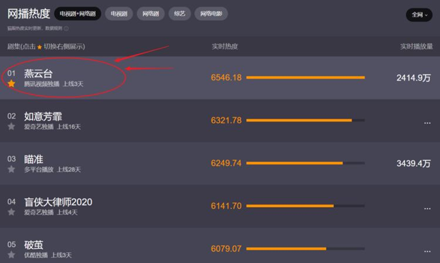 无独有偶,《燕云台》开播三天,腾讯视频播放量达到2400万,短短五天之内上了八次热搜。反观有些口碑俱佳的剧,待遇远不能与之相配,例如王倦的代表作《大宋少年志》豆瓣评分8.2,小成本校园剧《一起同过窗》拥有9.1分的优质成绩,二者长期处在“查无此剧”的状态,只偶尔在豆瓣或者知乎的“推剧榜单”上现身。