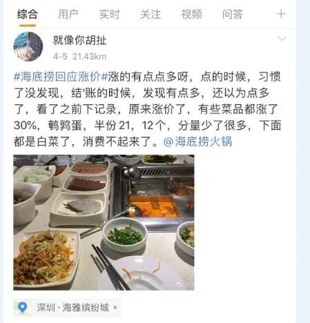 比如:“这么多人失业的大环境下,涨价是你的权利,少去是个人的自由。”“海底捞明显贵了,2个人吃了360元,之前差不多的菜品才花300出头!”“毛肚都快80元一份了,贵!”