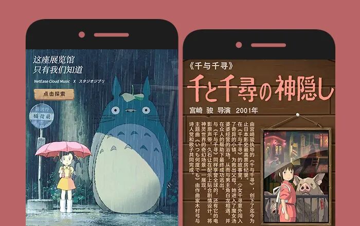 近日,网易云音乐与吉卜力工作室达成版权合作,我们耳熟能详的《龙猫》《千与千寻》《哈尔的移动城堡》《崖上的波妞》等知名动画热门音乐作品入驻网易云音乐。为此还造了座“吉卜力展览馆”引发网友热议,情怀满满。