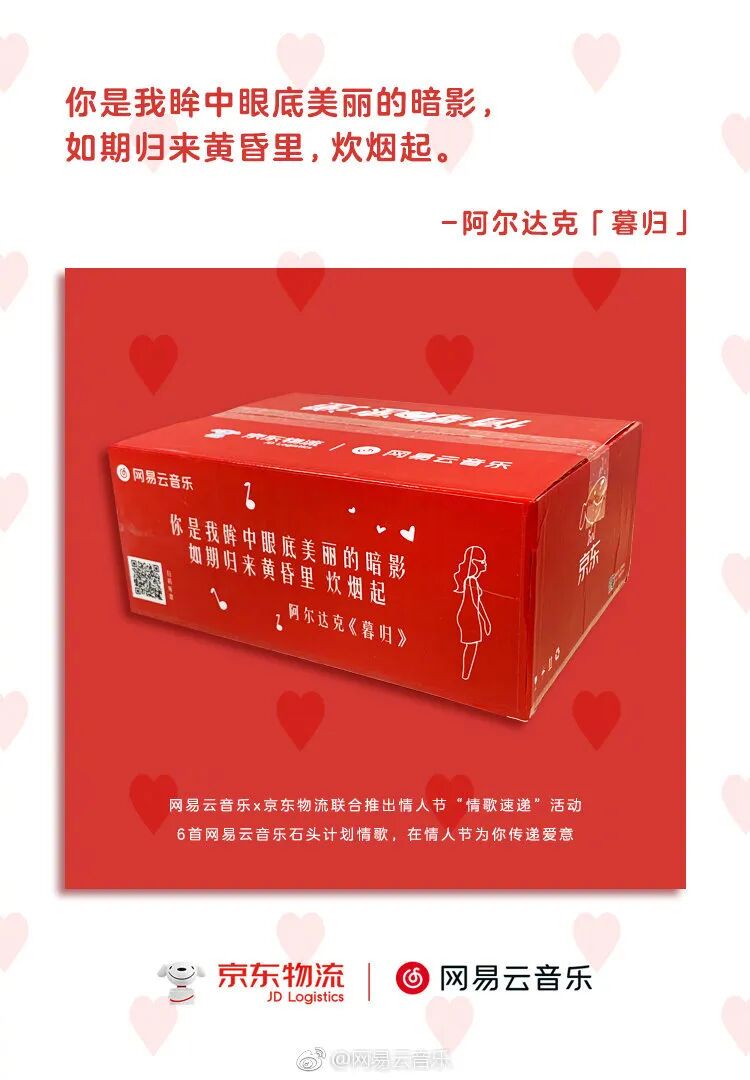 2019年情人节,网易云音乐跨界京东物流,快递箱X歌词IP将音乐“速递”到用户身边;