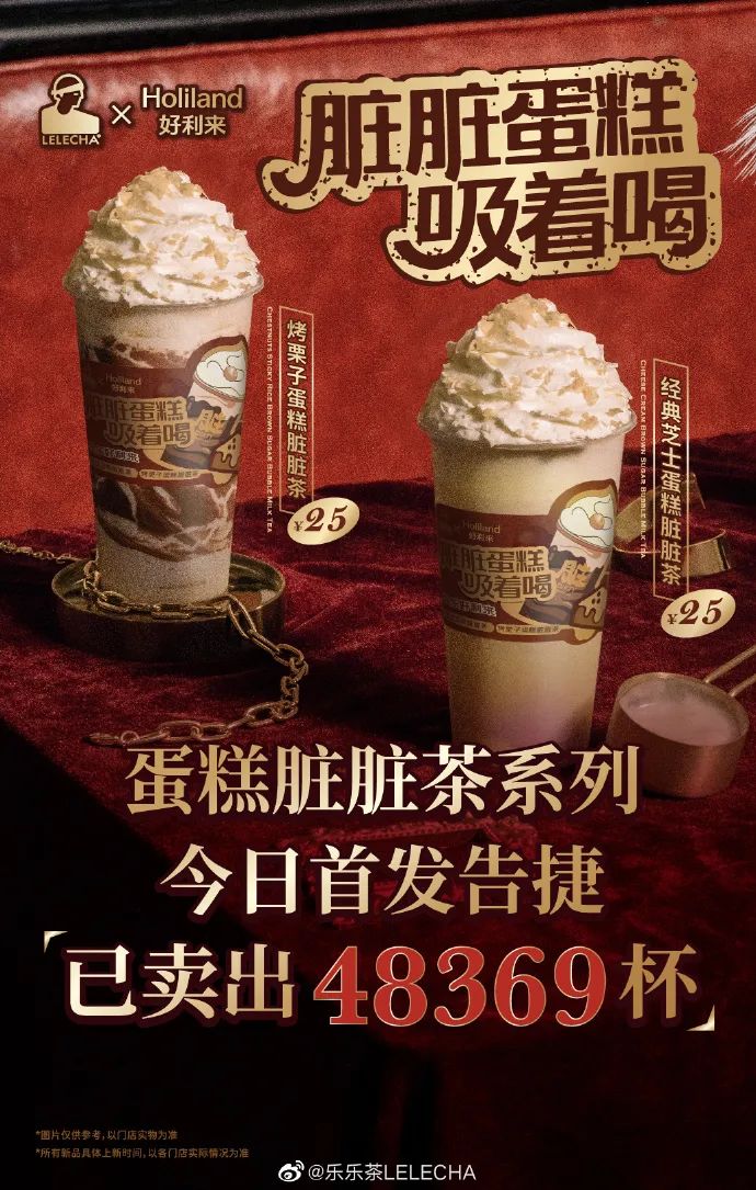 乐乐茶联名好利来上线“可以吸着喝”的限量脏脏蛋糕奶茶:「经典芝士蛋糕脏脏茶」和「烤栗子蛋糕脏脏茶」。一口蛋糕一口奶茶的创新搭配,让不少消费者眼前一亮,新品首发也取得了不错的销量。