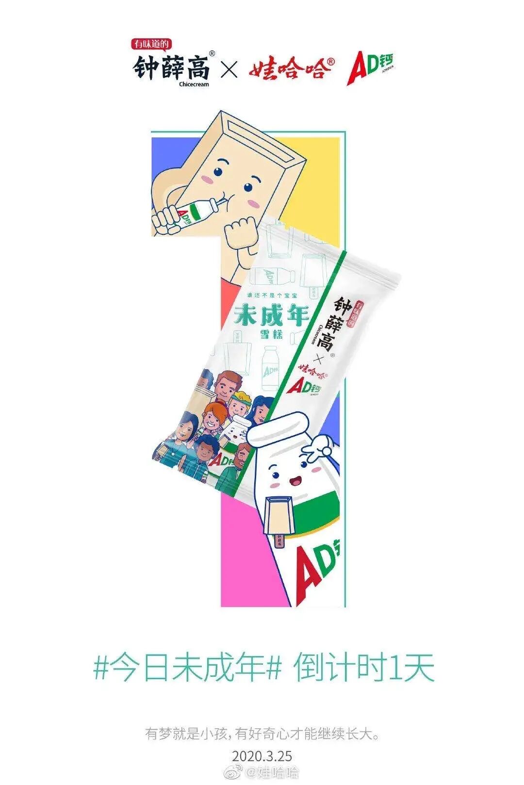 海报将沟通落点放在“管他几岁,好吃万岁”,一个层面是主张“未成年无罪”,另一个层面是在给大众创造消费“未成年雪糕”的理由。这次联名,娃哈哈找到了两个品牌间完美的结合点制造话题、相互助力,达到了吸引消费者眼球的目的。另一方面,从“情怀”出发的海报让这次联名更具有话题和传播性,同时给年轻消费者留下了“有趣”的印象,从而带动品牌年轻化的发展。