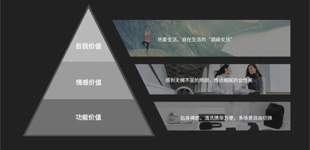 切换视角之后,女性不再是被消费、被营销的对象,而是更真实可感的人。借用马斯洛的需求金字塔,我们可以将品牌价值划分为三个层次,而Lululemon分别在三个层次塑造了新体验: