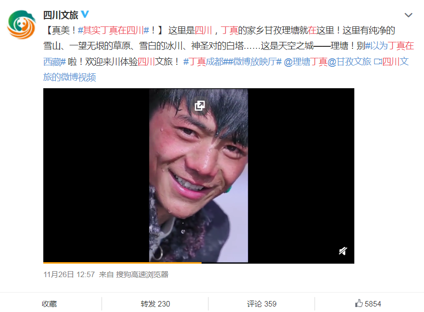 而后,11月19日,帮助丁真开通抖音账号,11月21日,开通新浪微博。 紧接着,甘孜文旅趁热打铁,拍摄了四川官方旅游宣传片《丁真的世界》,于11月25日在丁真的微博上发布。视频以丁真的视角和感触展开,甘孜州理塘县的美丽景色和风土人情在丁真的马背上、奔跑中、眼神里、独白中一一呈现。