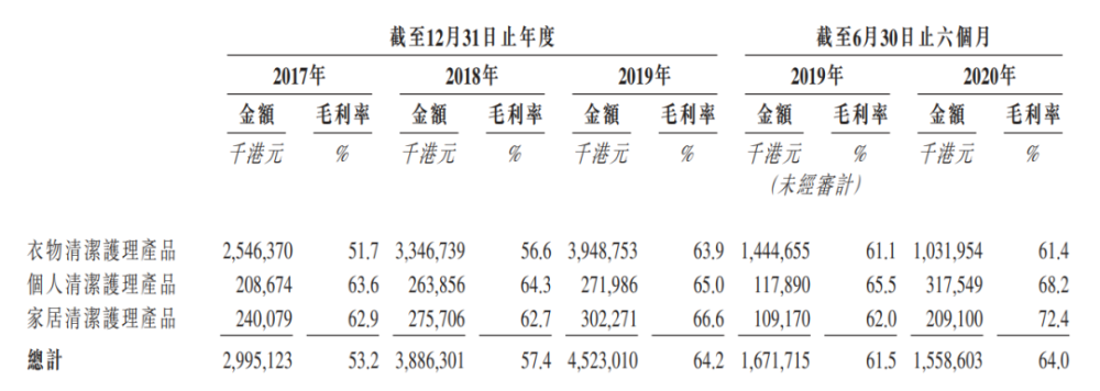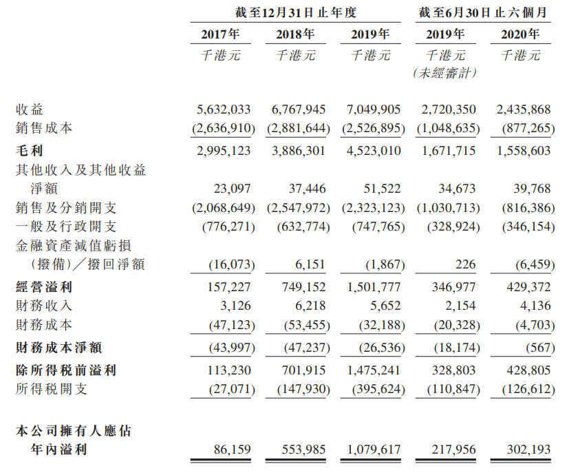 2017年、2018年、2019年与截至2020年6月30日止六个月,公司的毛利润分别为29.95亿港元、38.86亿港元、45.23亿港元与15.59亿港元,同期毛利率分别为53.2%、57.4%、64.2%与64.0%。