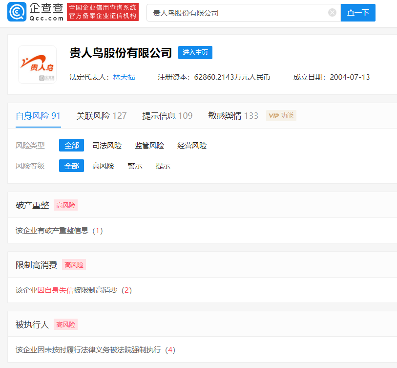 这并非首次。今年9月,贵人鸟就被厦门市中级人民法院、泉州市中级人民法院列为被执行人。目前,贵人鸟名下有5条被执行人信息,限制消费令2条,累计执行标的超4亿。逾期贷款、负债构造柱、总市值缩水率、股票退市风险性等也成为了其2020年来屡被谈及的关键字,在债务、贷款等压力下,已濒临退市边缘。贵人鸟是国内最早生产、销售各类休闲运动鞋的企业之一。2014年,曾头顶“A股运动品牌第一股”上市,市值一度达到数百亿元,其创始人林天福也曾凭借超100亿身家,成为2015年的泉州首富。
