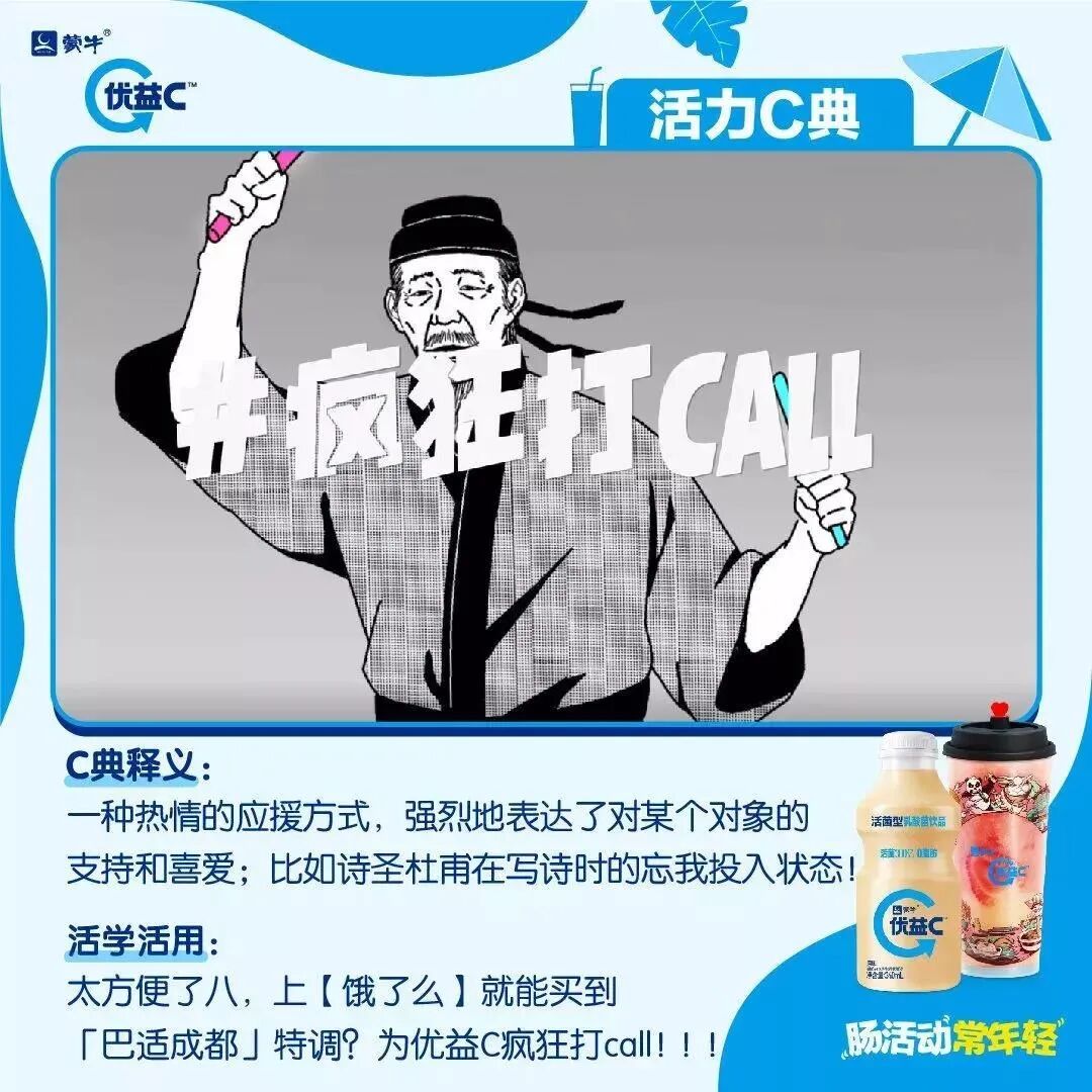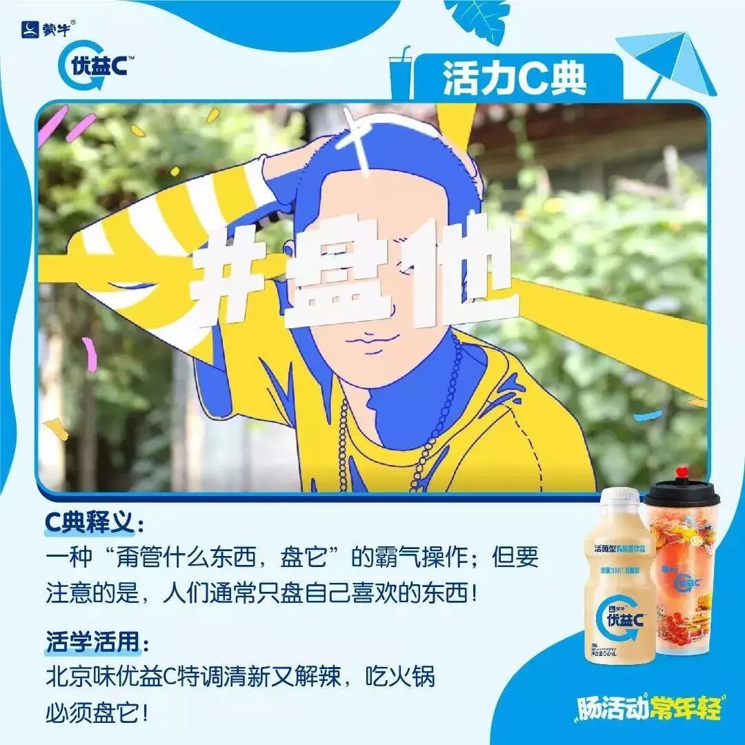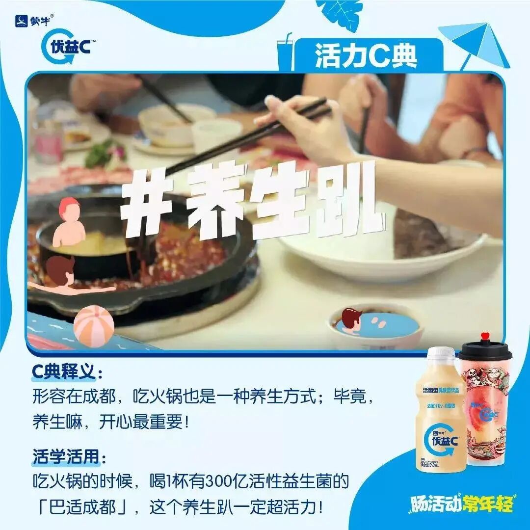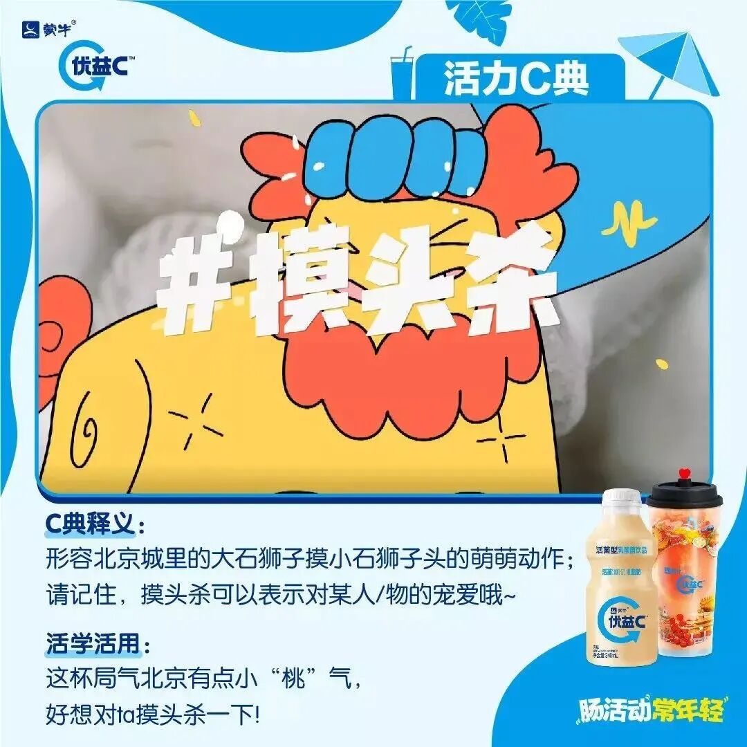 蒙牛优益C城市营销中,就将一系列网络热词和地域文化进行结合,比如北京的“摸头杀”成都的“养生趴”、给人耳目一新的效果。