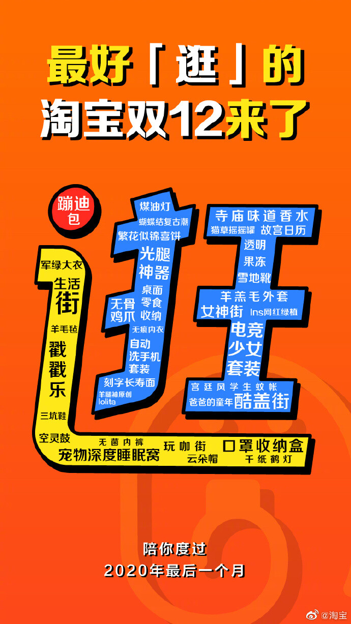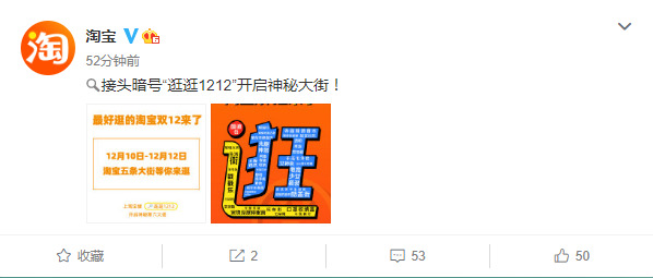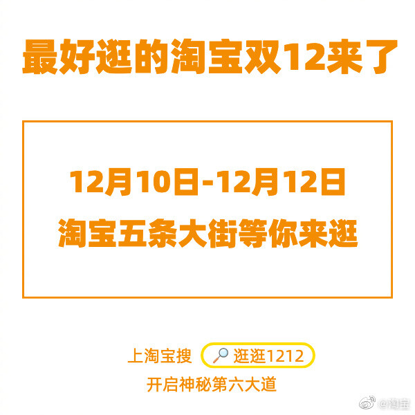 12月7日消息,淘宝今日发布官方微博称,12月10日至12月12日,淘宝将推出“五条大街”和“逛逛1212”神秘大街活动。