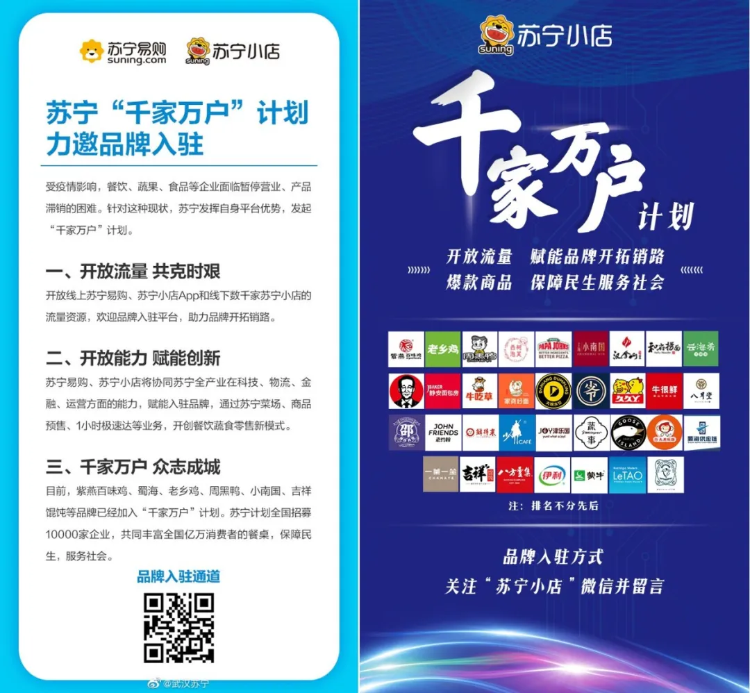 特殊时期,由于消费者少出门,线下实体门店消费需求减少。首当其冲的就是餐饮行业,这些企业除了承担着房租、工资等硬性支出;由于提前准备大量食材,还面临着餐饮店产品滞销问题。基于餐饮企业滞销的痛点洞察,苏宁易购推出“千家万户”计划,帮助滞销品商家拓展全新的销售渠道。苏宁整合开放线上App及线下数千家苏宁小店流量资源,邀请品牌入驻苏宁,并且给加盟商家很大的政策支持,主打“零门槛入驻”概念,具体表现在账期、扣点、费用方面做出最大的让利,为他们打造线上线下的销售渠道。截止目前为止,项目吸引紫燕百味鸡、蜀海、老乡鸡、周黑鸭、吉祥馄饨等多个连锁品牌加入。