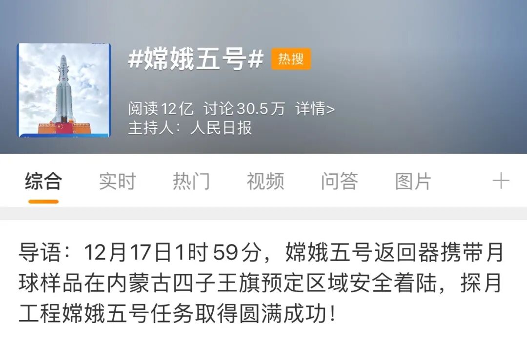 12月17日,“嫦娥五号”携带月球样品顺利返航的消息在社交网络不胫而走。