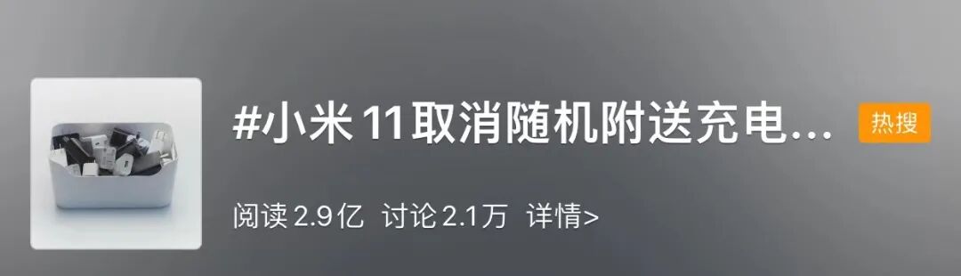 和往年差不多,新款小米手机有人吹,也有人骂,不过今年骂的格外多,因为小米取消了“随机附赠的充电头”。12月26日早间,雷军更新了一条微博,宣布小米11主打轻薄,即将轻装上阵,轻薄的背后,做了一个重要决定:取消随机附送充电器。雷军声称,用户家中有很多充电器和耳机堆着不用,为了减少资源浪费,避免造成环境负担,就取消了,总之就是为了环保。同时留了一个悬念:“在行业惯例和环保之间,是否有更好的解决方案,将在发布会上讨论。”消息一出,立刻引发轩然大波,小米被骂上微博热搜,截止发稿前,#小米11取消随机赠送充电头#收获2.9亿阅读量,2.1万讨论量。网友们不管小米的解决方案是什么,直接开骂,雷军微博评论区出现了大量嘲讽言论:“不买,立即环保百分百,雷总真是有心了”、“不学点好,你要是不生产这个11更环保”。还有网友发表意见说到:“苹果起了个坏头,国产小米第一家跟进,这样下去以后数据线都会取消”、“小米真的是飘了,刚刚站稳高端市场就自寻死路”。众所周知,小米在创业初期曾模仿过苹果,但这并不算什么丢人的事儿,毕竟小米这么些年一点点发展有了自己的风格。但问题是,小米前脚刚嘲讽完苹果12不送充电器,短短两个月时间,自己就模仿了起来,这样的行为遭到网友讽刺也就不足为奇了。因为小米不仅取消附赠充电器,连取消的理由都在复制粘贴苹果。