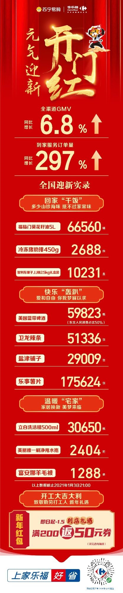 来源:联商网(原标题:苏宁家乐福元旦战报出炉,到家订单量同比增长297%)