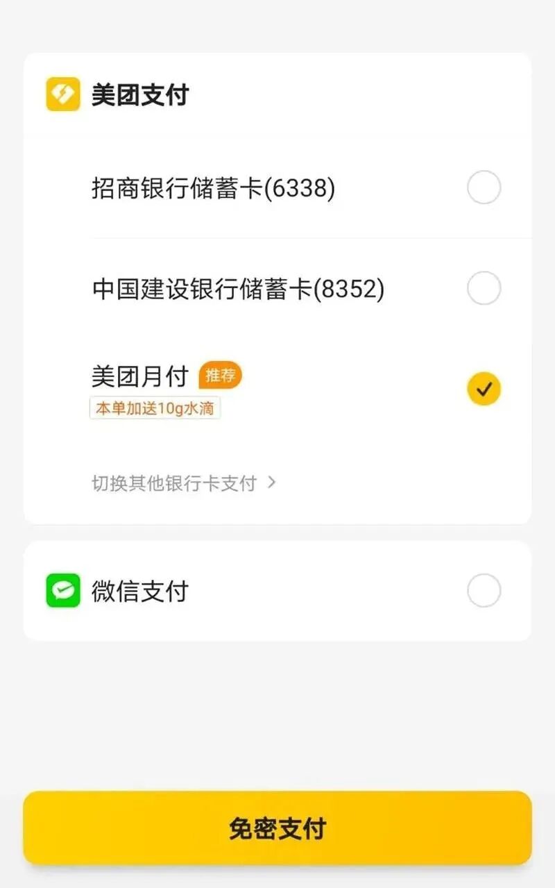 而美团的反应是,恢复了支付宝支付的渠道,但是却将支付宝支付的方式折叠起来了,美团月付以及银行卡支付都位于支付列表的前列,微信支付紧随其后。很显然,美团虽然在支付上妥协了,但仍然通过其他方式抵制竞手。