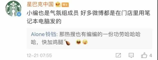 并在第二天早上,星巴克转发了这条热搜,同时在评论区里“坦白”:小编也是气氛组成员,好多微博都是在门店里用笔记本电脑发的!
