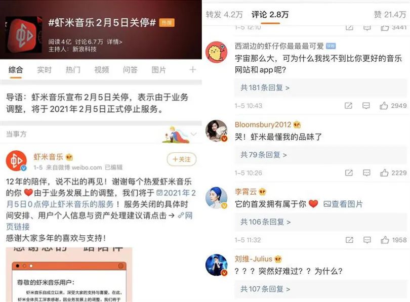1月5日上午,虾米音乐宣布播放器业务将于2021年2月5日正式停止服务。而#虾米音乐2月5日关停#已连续占据微博热搜,截止1月7日,话题阅读量已飙升至4亿。