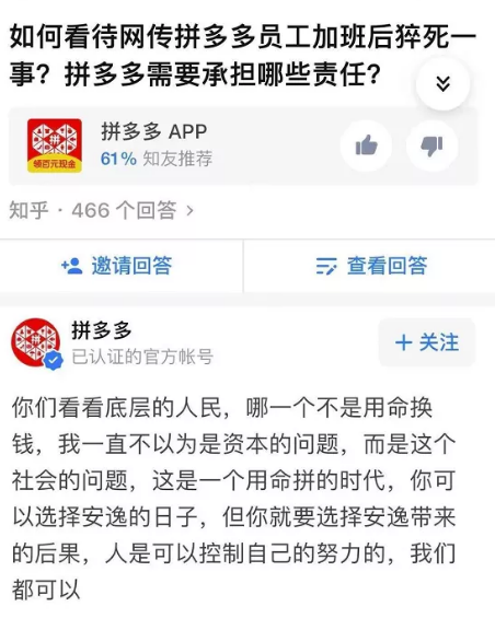 拼多多23岁年轻女员工加班猝死,引发舆论关注,几天来可谓一波三折。拼多多先是“挺身而出”,在知乎官号上言论无下限,直呼底层人民拿命换钱是社会问题,不是资本问题,选择安逸,就要承担安逸的后果。