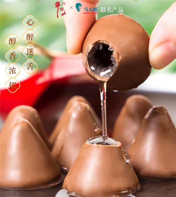 有国潮范儿,有京味底蕴的包装设计,更有“醉”心味道。马大姐与牛栏山的联名可谓是一点也不马虎,除了外在上的出彩,往里更深入的将味道进行了恰到好处的融合。浓郁的酒香、糖霜的甜蜜、巧克力的香醇,成就了马大姐牛栏山二锅头风味酒心巧克力,“有酒不是酒,醉心不醉人”,给舌尖上的味蕾来一场甜蜜与沁醉的碰撞。