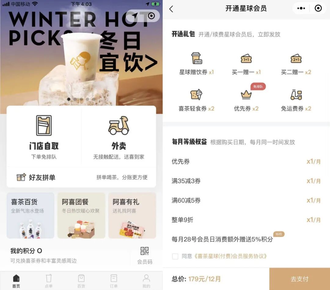 此外,喜茶还制定会员体系来增加用户粘性,比如推出星球会员政策,消费者先付款179元,才能购买到12个月的「星球会员」身份。获得星球会员的好处是有很大多优惠,可以享受双倍积分,并且开通就会立刻获得一批优惠券等等。