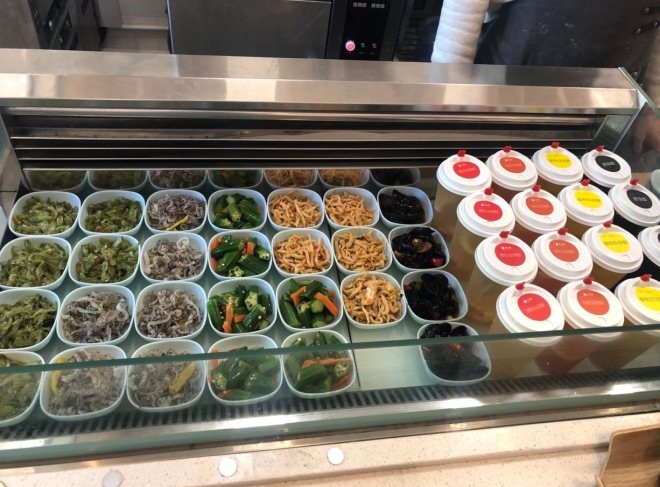 菜品都是以秋葵、木耳等小菜为主,还有一些酸梅汤、果茶,一起陈列在冰柜,顾客可以自助选择放到餐盘上!