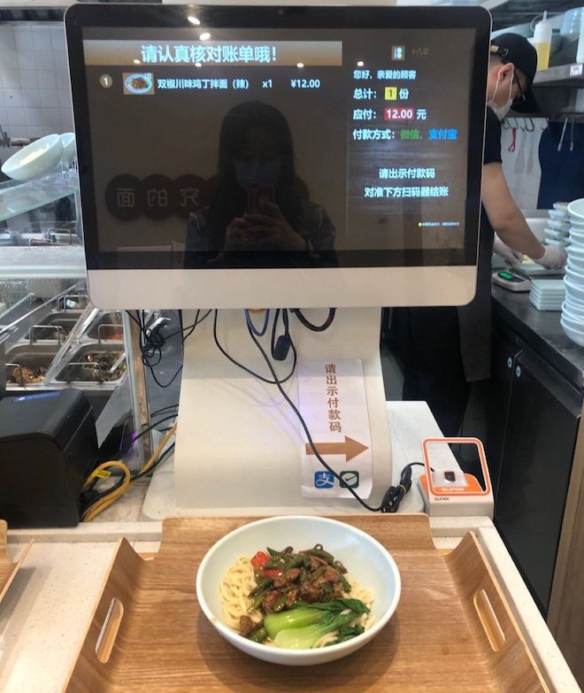 一字型的动线设计,顾客依次按照“自取餐盘——自选小菜饮品——选择面条浇头——自助结账”四个步骤来点餐。