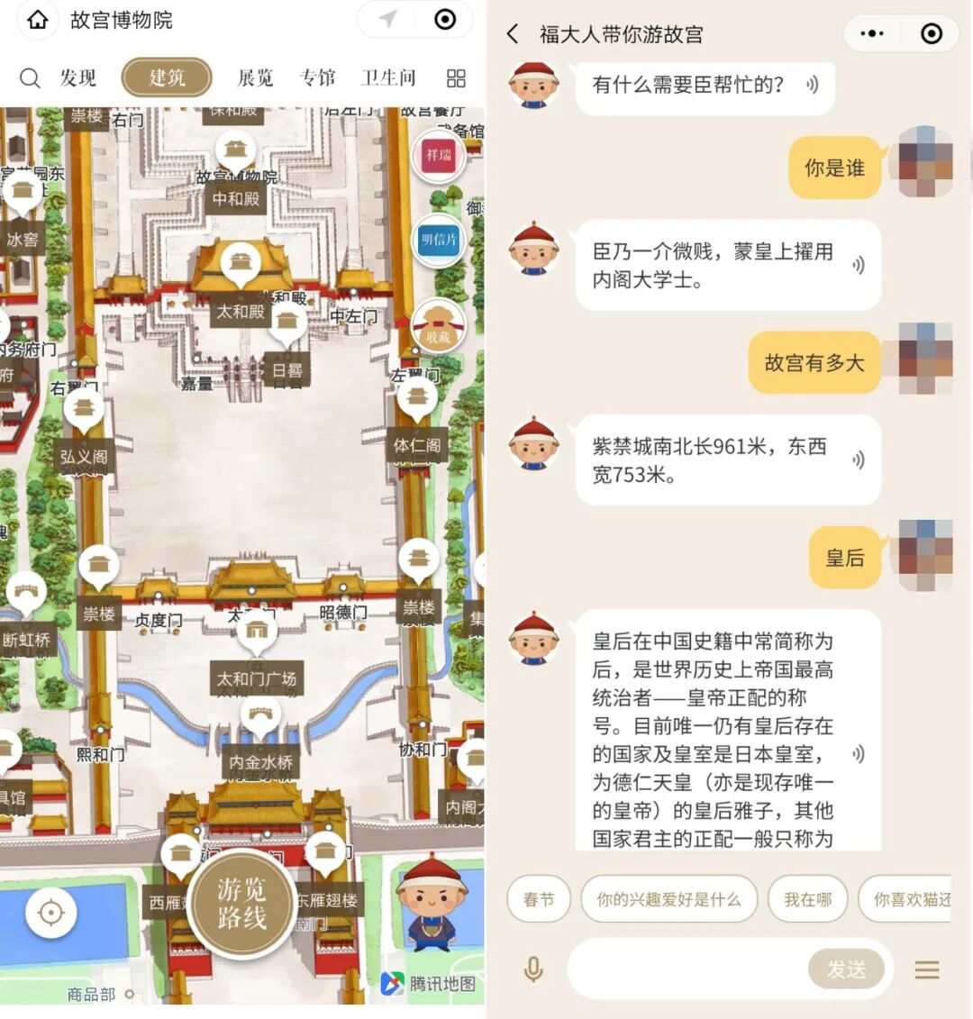 比如我们所看到的福大人,从说话语调到语言都高度演绎“朕”的形象,它还有特定的口头禅,比如“臣对此有些了解”、“由臣来为你解惑”等。福大人跟用户的互动,不是没有灵魂的机械式回复,自然增强大家游览故宫的代入感。