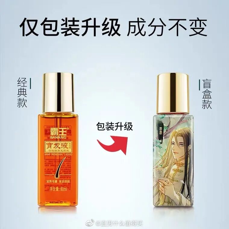有网友表示,在看到《霸王》洗发水限定“二次元”盲盒时,差点笑出了声,难道开出不一样的盒,就能生出不同颜色的头发?相比于买盲盒的刺激,我更想要第二天一头乌黑浓密头发带来的惊喜。