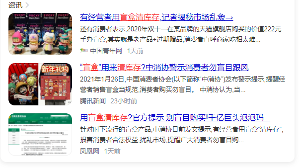 无独有偶,前两天中消协也给盲盒泼了盆冷水,点名盲盒消费。中消协认为,当前有的经营者产品本身并没有过硬的竞争力,有的经营者将盲盒当做是“清库存”的工具。