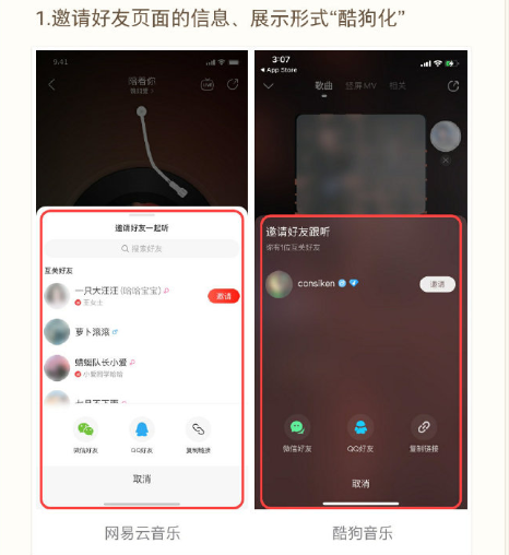 整篇文章阴阳怪气、火药味十足,直指酷狗“跟听”copy网易云“一起听”;酷狗“音乐推”copy网易云“云贝推歌”,并贴出了具体证据,大家可以对比看一下。