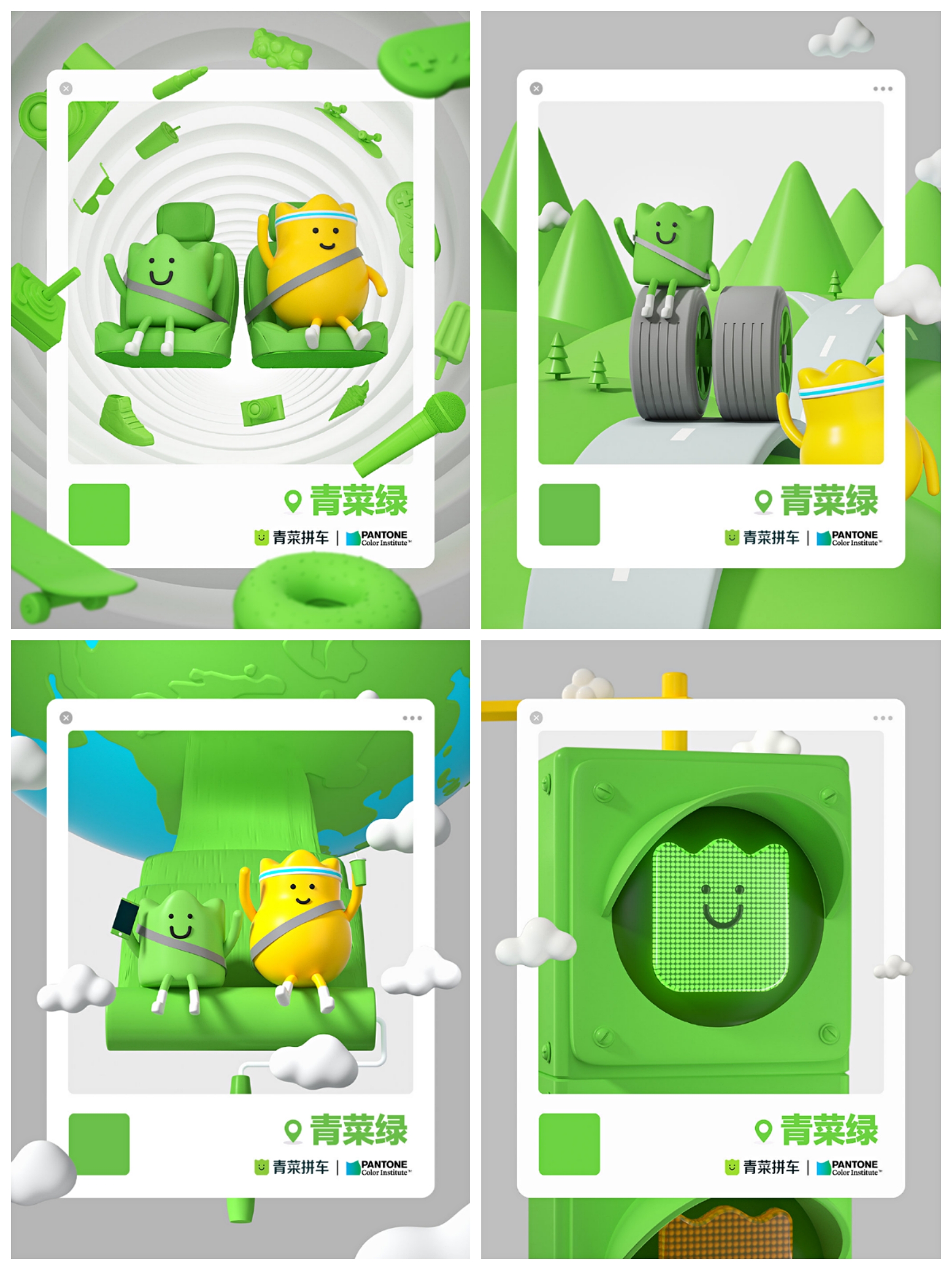 除此之外,由“青菜绿”延展运用,以品牌IP形象“青菜”和“灯泡”为主,通过具亲切感的形式演绎了出行的日常场景,画风以3D场景插画设计呈现,尤其生动。