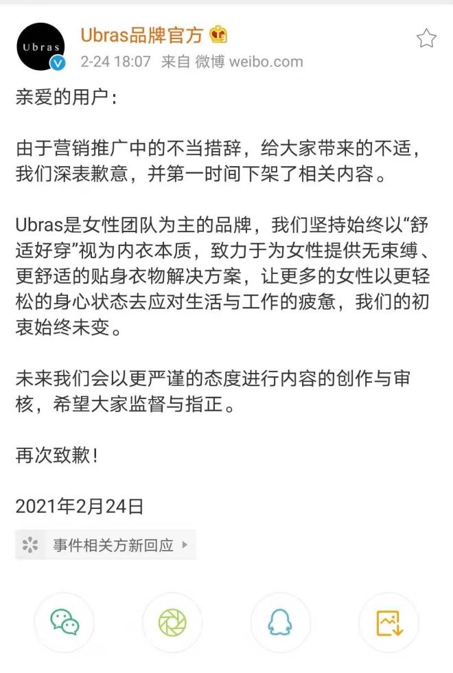 晚上18点07分,Ubras品牌官方发布了致歉声明,称由于营销推广中的不当措辞,给大家带来不适,深表歉意并第一时间下架了相关内容。