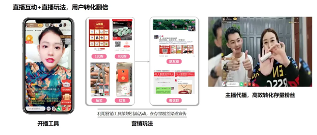 第四,独家技术推动直播连麦带货,无货可播的主播,与货品积压的货主双向打通,助力双方生意不停,卖货照旧;